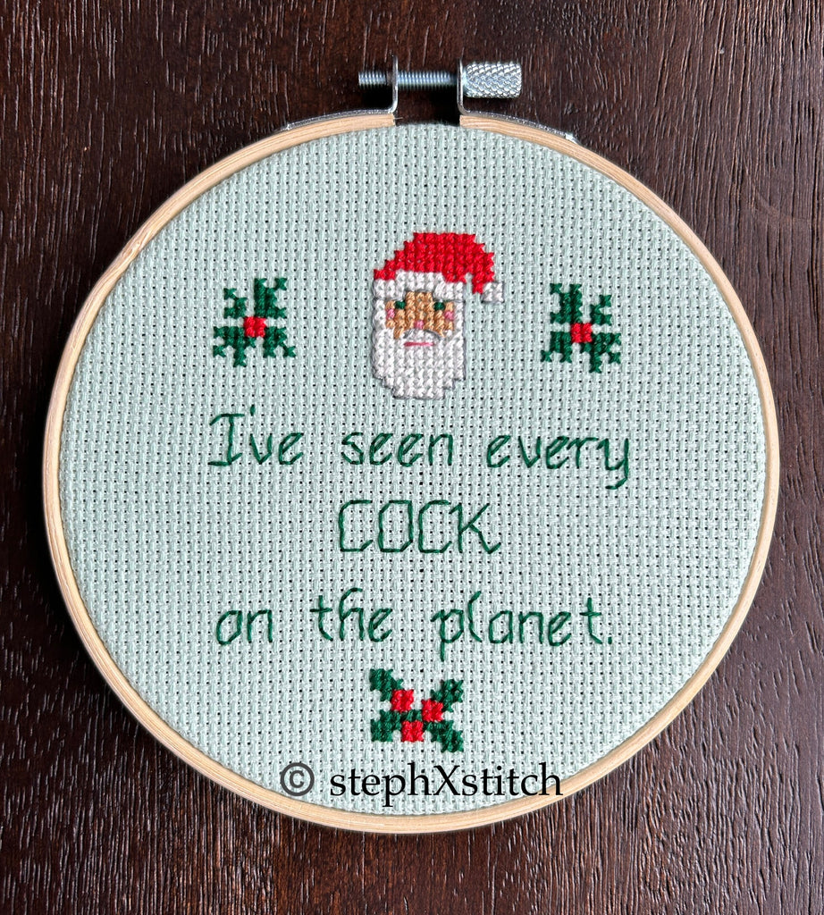 Hand-stitched on festive holiday colors on light green aida fabric and framed in a 5-inch wooden hoop. Ready to hang on your wall.