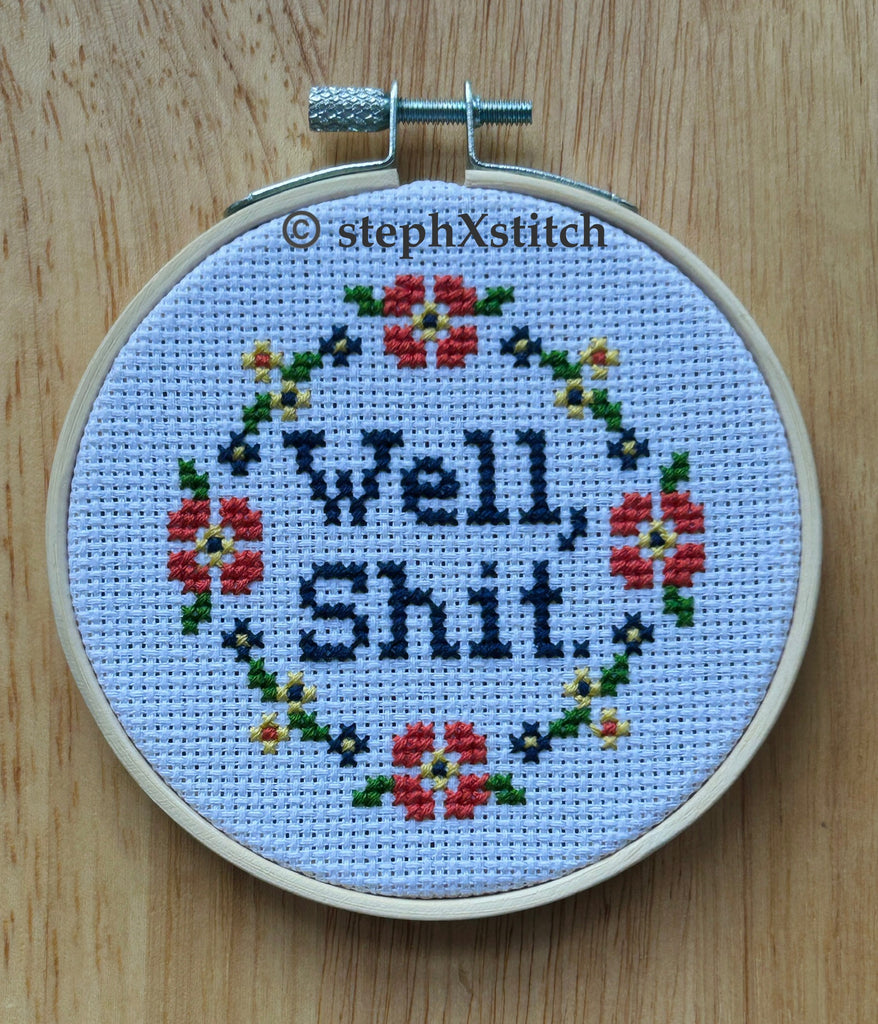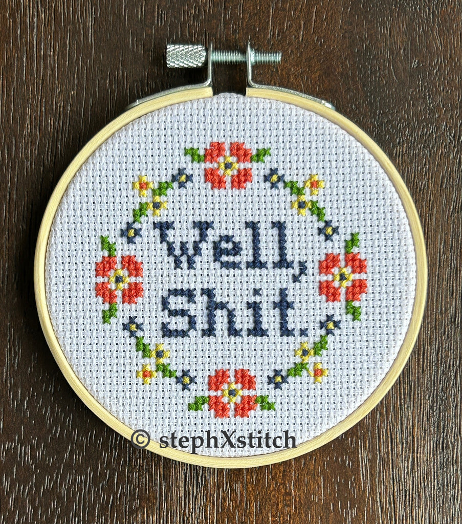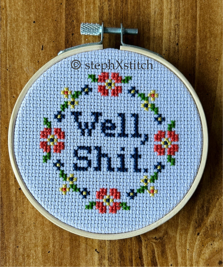Hand-stitched in DMc embroidery floss on white cotton aida fabric and framed in a 4-inch wooden hoop. Ready to hang on your wall!